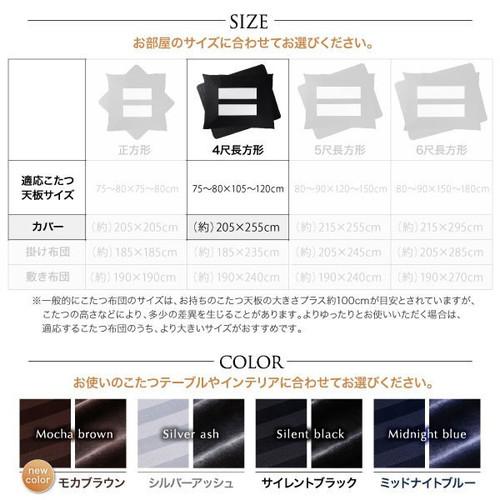 [サイズ]*正方形 カバー:(約)205 205cm掛け布団:(約)185 185cm敷き布団:(約)190 190cm 適応こたつ机天板サイズ:75〜80 75〜80cm*4尺長方形カバー:(約)205 255cm掛け布団:(約)185 235cm敷き布団:(約)190 240cm適応こたつ机天板サイズ:75〜80 105〜120cm*5尺長方形カバー:(約)215 255cm掛け布団:(約)205 245cm敷き布団:(約)190 240cm適応こたつ机天板サイズ:80〜90 120〜150cm*6尺長方形カバー:(約)215 295cm掛け布団:(約)205 285cm敷き布団:(約)190 270cm適応こたつ机天板サイズ:80〜90 150〜180cm【生地】[カバー]側地:綿 50%、ポリエステル 50%[こたつ布団]掛け布団:(表地・中わた・裏地)ポリエステル100%敷き布団:(表地・中わた・裏地)ポリエステル100%【生産国】中国【注意事項】※サイズは概算です。