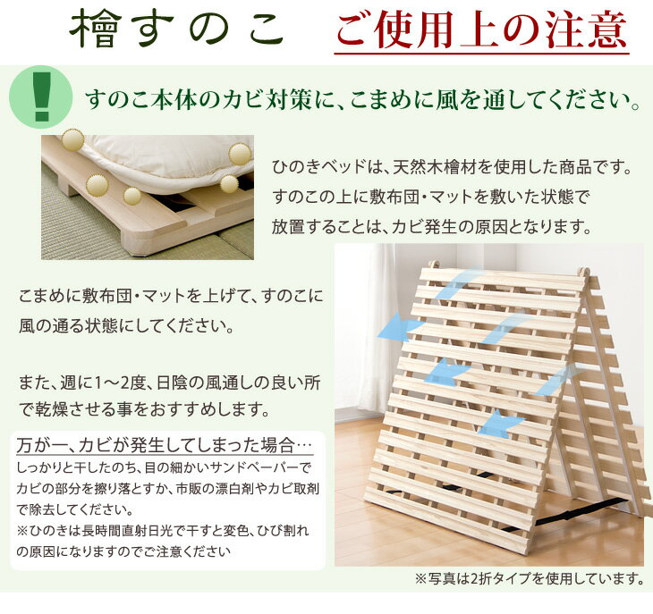 ▼4つ折りタイプの檜すのこマットはこちら▼シングル▼さらにしっかり湿気対策!▼吸水力抜群!ベルオアシス使用日本製 湿気取りマット お布団の消臭もできる!竹炭入り除湿シート 東洋紡モイスファイン30%日本製 湿気取り敷きパッド仕様サイズ外寸:幅97×長さ198×高さ2.5cm すのこ厚:2.5cm すのこ幅:7cm すのこ間隔:3cm【スタッフひーちゃんのおすすめポイント】・布団を湿気・結露から守るすのこマット ・心地よい香りと高い耐久性を持つ天然檜を使用・風を通しやすい、床からのすのこ厚2.5cm ・お子様にも安心の低ホルムアルデヒド仕様 ・布団を敷いたまま三つ折れに!片付け楽々・折りたたみ固定は簡単マジックテープ式 ・キズ防止クッション付き 重量 約9kg 素材 桟板・すのこ:檜(無塗装) ※低ホルムアルデヒド仕様 カラーナチュラル 梱包サイズ 22×22×98.5cm 生産国 檜:日本産 製造:中国(ISO9001認定工場で生産)送料【送料無料(沖縄県・離島は送料別途)】※沖縄県・離島の場合はお問い合わせください。