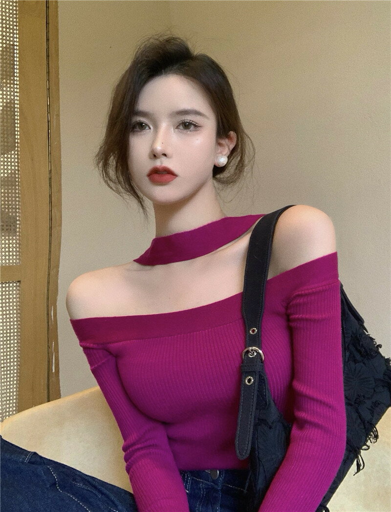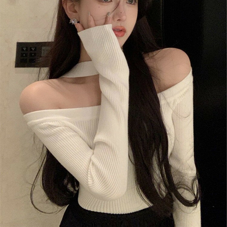オフショルダーのデザインとタイトなサイズ感がセクシーなリブニット。