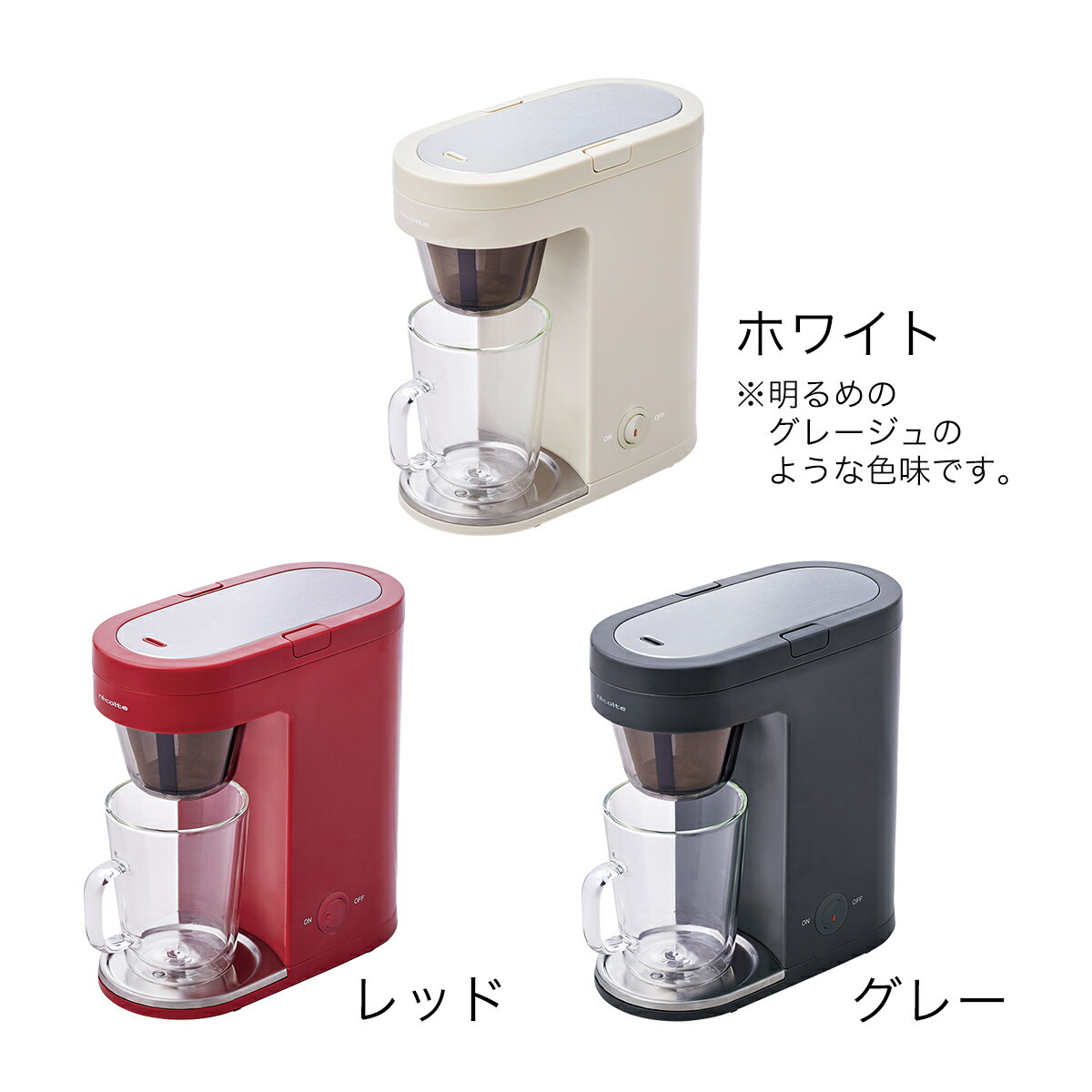 サイズ 本体:約 幅 95mm×奥行き 185mm×高さ 195mm ダブルウォールマグ:約 幅 75mm×奥行き 100mm×高さ 95mm( 取っ手含む ) 重さ 約 850g コード長 約 1m 素材 本体:ABS樹脂、トライタン、ステンレス ダブルウォールマグ:耐熱ガラス 電源 AC100V 50/60Hz 消費電力 約 350W 種類 ドリップ式( 水容器着脱型 ) 最大使用水量 約 200mL 機能 ・Smart Coffee®システム ・温冷対応耐熱ガラス製ダブルウォールマグ( 容量:約 200mL ) 保証期間 メーカー保証1年 付属品 ステンレスフィルター、ダブルウォールマグ、計量スプーン( すりきり約 10g )、専用レシピシート、取扱説明書( 保証書含む ) 備考 ・続けて使用する場合は、5分以上休ませてください。