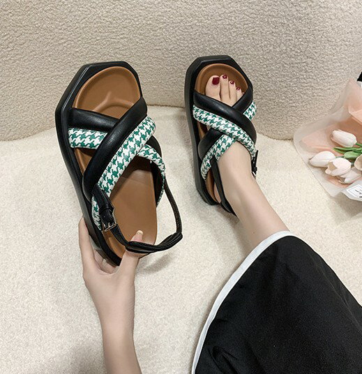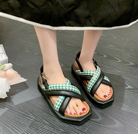 立体感のあるクロスベルトと カクカクに縁取ったソールが目を惹く デザインにこだわった一足です。