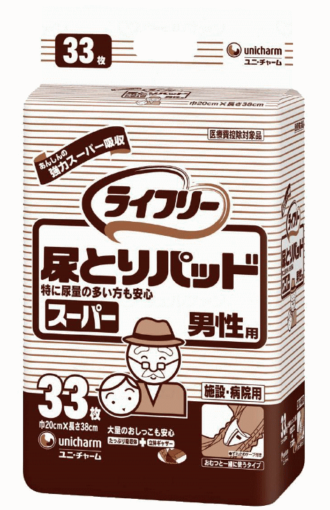 [施設・病院用] ライフリー 尿とりパッド男性用 スーパー 33枚入り 1袋 ユニ・チャーム 大人用 排尿3回分 おむつ 紙パンツ 尿取りパッド 使い捨てオムツ 高齢者 シニア 下着 介護 失禁 病院 施設用 敷きパッド 漏れ安心 Gライフリー