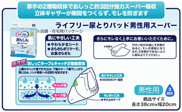 ○肌にやさしい工夫 やわらかなシート さらさらポリマー配合でお肌さらさら ○漏れない工夫 ずれ止めテープ 商品名 ライフリー 尿とりパッド男性用 スーパー タイプ パッドタイプ 吸水量 450cc(おしっこ約3回分) サイズ・袋入り数 幅20×長さ38cm 1袋33枚入り 注意事項 ※画面上と実物では多少色具合が異なって見える場合もございます ※複数店で在庫を共有しているためご注文のタイミングで在庫を確保できない場合がございます。