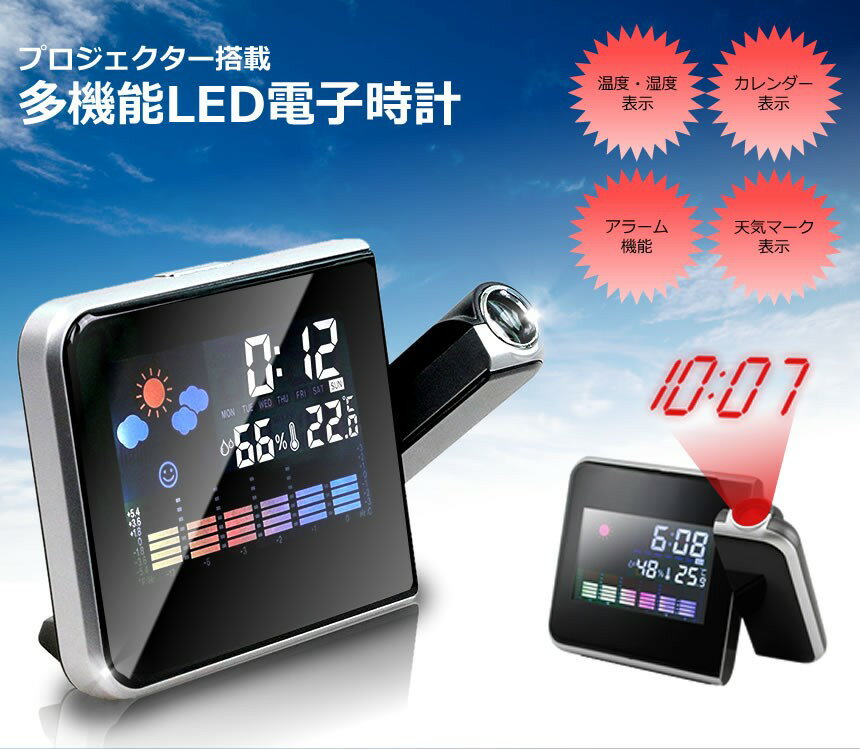 送料無料(メール便にて発送致します)ボタンを押すとプロジェクターが時刻を映し出す お部屋をお洒落に演出します 時計以外にも様々な機能を搭載 ・温湿度表示 ・カレンダー表示 ・最高/最低温湿度表示 ・天気マーク表示 ・アラーム機能 夜間でもハッキリ時間が見える バックライト機能搭載 【機能】 ・時間投影 約1〜3m(180°回転可) ・カラースクリーン ・LEDバックライト ・温湿度表示 湿度範囲:20%〜99% 温度範囲:0℃〜50℃/32°F〜122°F ・日期表示:2001〜2099年 ・最高/最低温湿度表示 ・アラーム機能 商品サイズ:約 140×50×90mm 重さ:235g 電池:単4×2本別売 ※リセットボタンのような小さな穴がありますが飾りです。