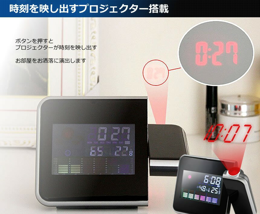 温湿度計 LED 電子時計 アラーム 気象 天気 予報 投影 室内 温度計 湿度計 最高 最低 卓上 スタンド プロジェクター バックライト TEC-PROCLOD