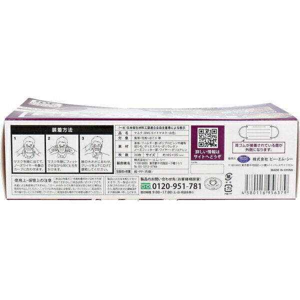 株式会社ビー・エム・シー個装サイズ:200X55X105mm個装重量:約117g内容量:30枚入製造国:中国【発売元:株式会社ビー・エム・シー】【品名】マスク【サイズ】ミディアム:約165×95mm【対象】風邪・花粉・ほこり等【素材】本体、フィルター部:ポリプロピレン不織布耳ひも:ポリエステル・ポリウレタンノーズフィッター部:ワイヤー・ポリエチレン【使用方法】(1)マスクを顔に当ててノーズワイヤーを鼻のカーブに合わせます。