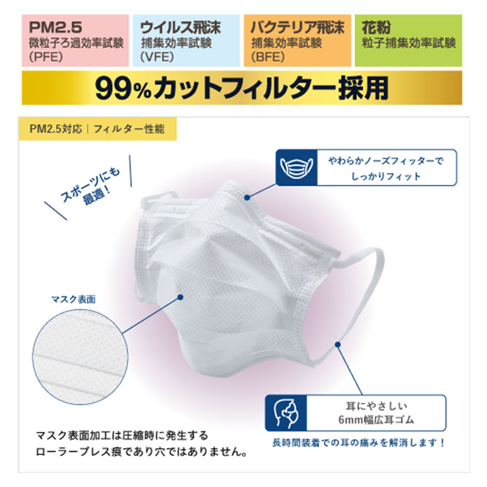 99%カットフィルター採用(PFE・BFE・VFE) ■素材 本体:ポリプロピレン不織布 耳ひも:ポリエステル・ポリウレタン ノーズフィッター:ワイヤー・ポリエチレン ■商品サイズ ・マスク1枚あたり 約 幅16.5×奥行1×高さ9.5cm ・箱サイズ 約 幅20×奥行10.5×高さ5.5cm ■重量 ・マスク1枚あたり 約2g ・1箱あたり 約 122.5g 特記事項:本品は1日使いきりタイプです。