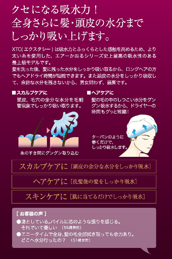 より太い糸を使用し、吸水力とふっくら感を高めたエクスタシーは、スキンケア・ヘアケア・スカルプケアに最適。