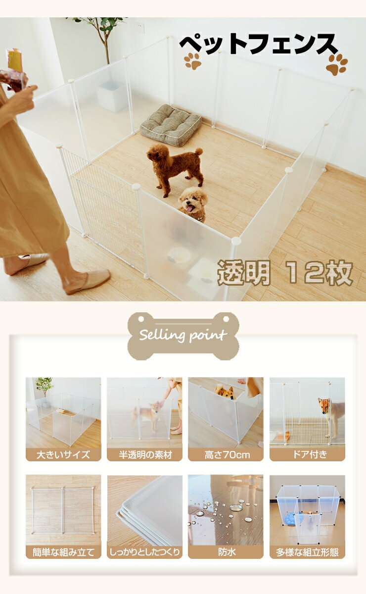 ペットフェンス ジョイント ドア付き 透明 50×70cm 12枚 組立簡単 置くだけ レイアウト自由 防水 ペット 犬 室内 屋内 ペットサークル 柵 ドッグ ケージ パーテーション 間仕切り ペット用品 ペットグッズ【送料無料】