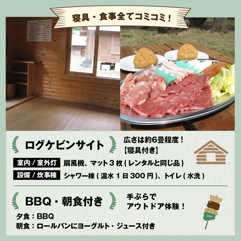 1泊2食付き ログケビンサイト宿泊券【3名様分】【宿泊券・キャンプ・アウトドア・バーベキュー】 寝具も食事も込みの、お手軽にキャンプを楽しめる宿泊券です。