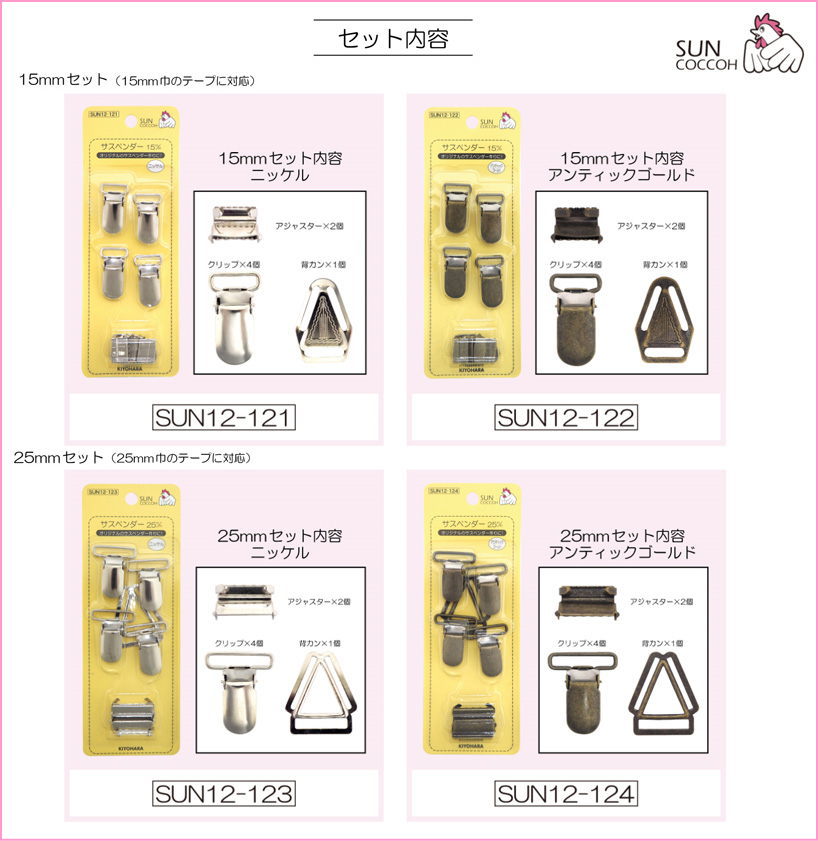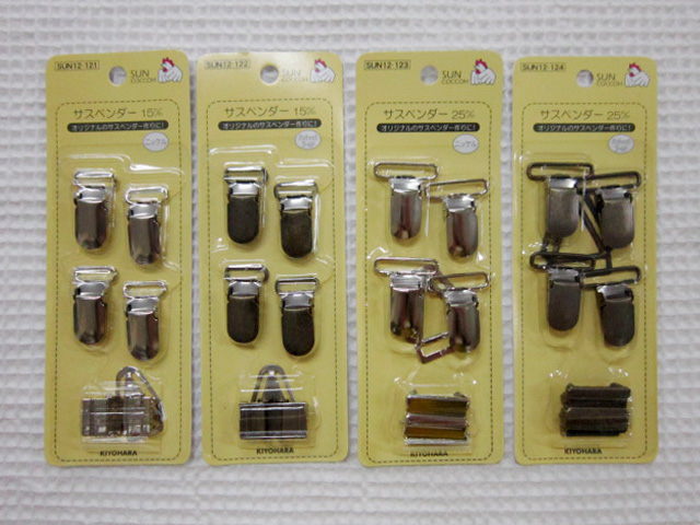 ズボンやスカートを吊り下げるオリジナルの『サスペンダー』を手作りできる金具セットです。